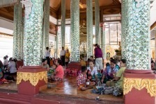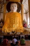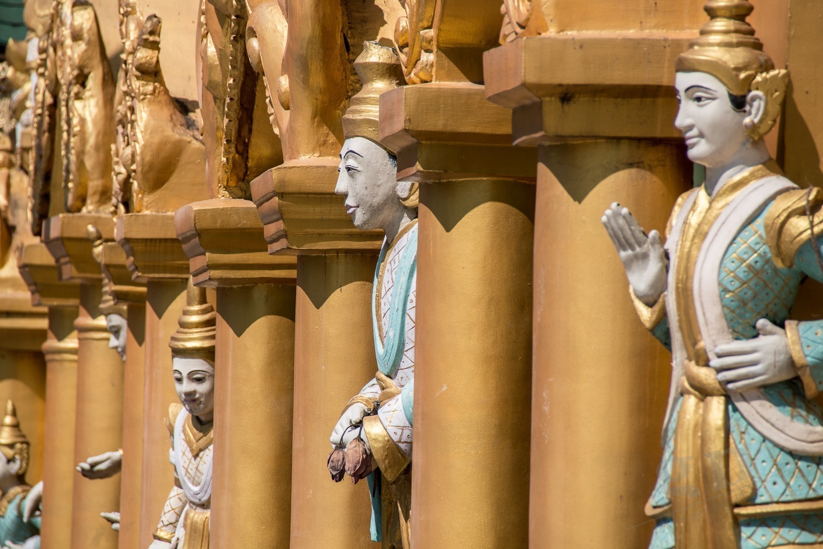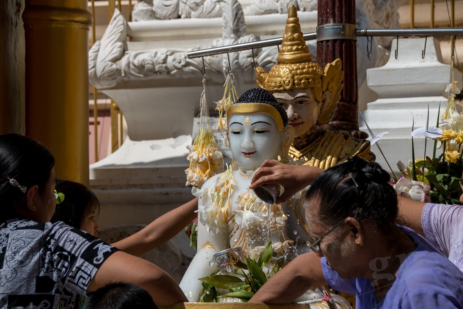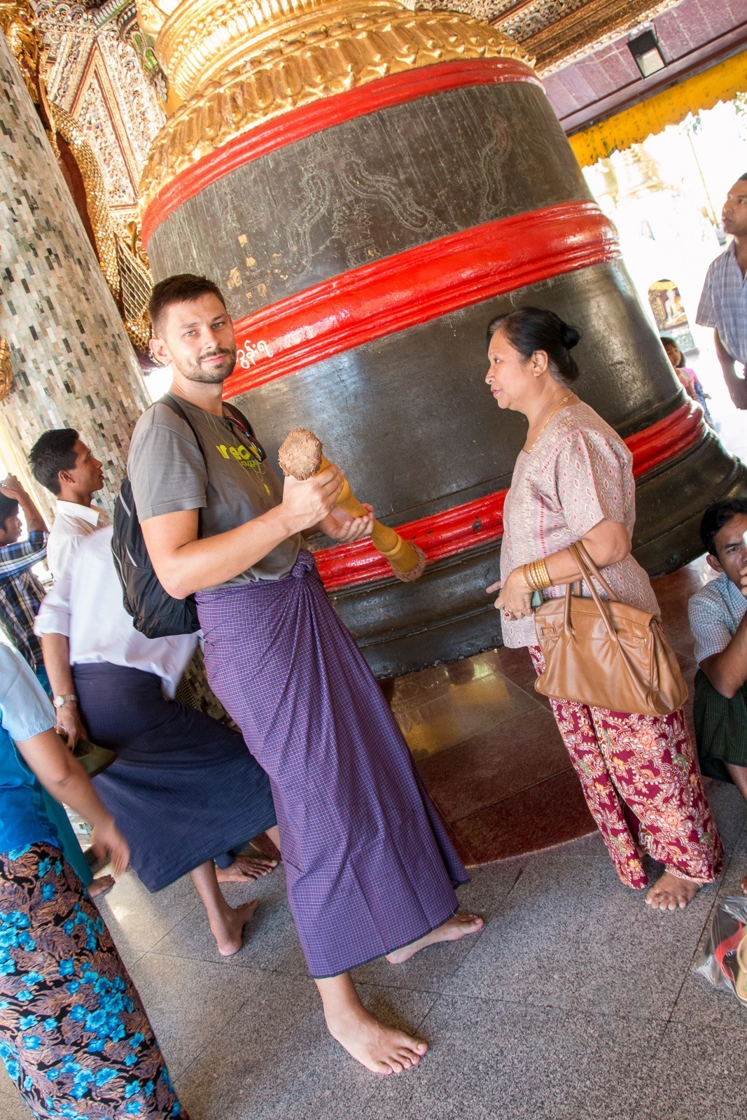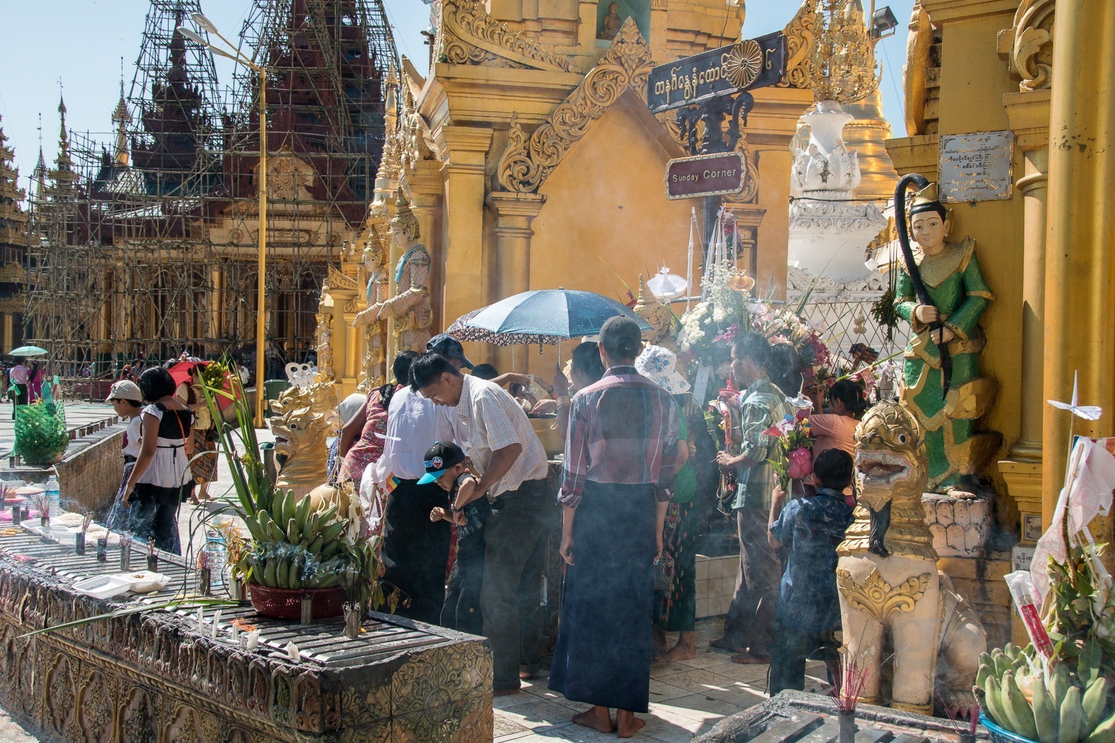 Wir steigen die lange Treppe zur Pagode hinauf. Und ab jetzt geht unser Mund nicht mehr zu. Wir kommen aus dem Staunen nicht mehr heraus. Gold und Buddhas. Und noch mehr Gold und noch mehr Buddhas. Wir werden von einer Frau angesprochen, ob sie uns durch die Pagode führen darf. Aber gerne doch! Unser Guide führt uns an unseren persönlichen Schreinen vorbei, denn jeder Wochentag hat hier eine eigene Ecke: Die Birthday-Corner. Wir sind beide an einem Freitag geboren und jeder Wochentag hat einen eigenen Schrein. Natürlich aus Gold. Die Kuppeln der riesigen Tempel sind aus Gold. Die Buddhas sind aus Gold. Wir sehen fast keine Touristen an diesem Ort. Wir werden sogar von Einheimischen fotografiert. Nach einigen Stunden voller goldener Buddhas und goldener Tempel wird der Fußboden immer wärmer und auf den teilweise schwarzen Fliesen verbrennt man sich die Füße.