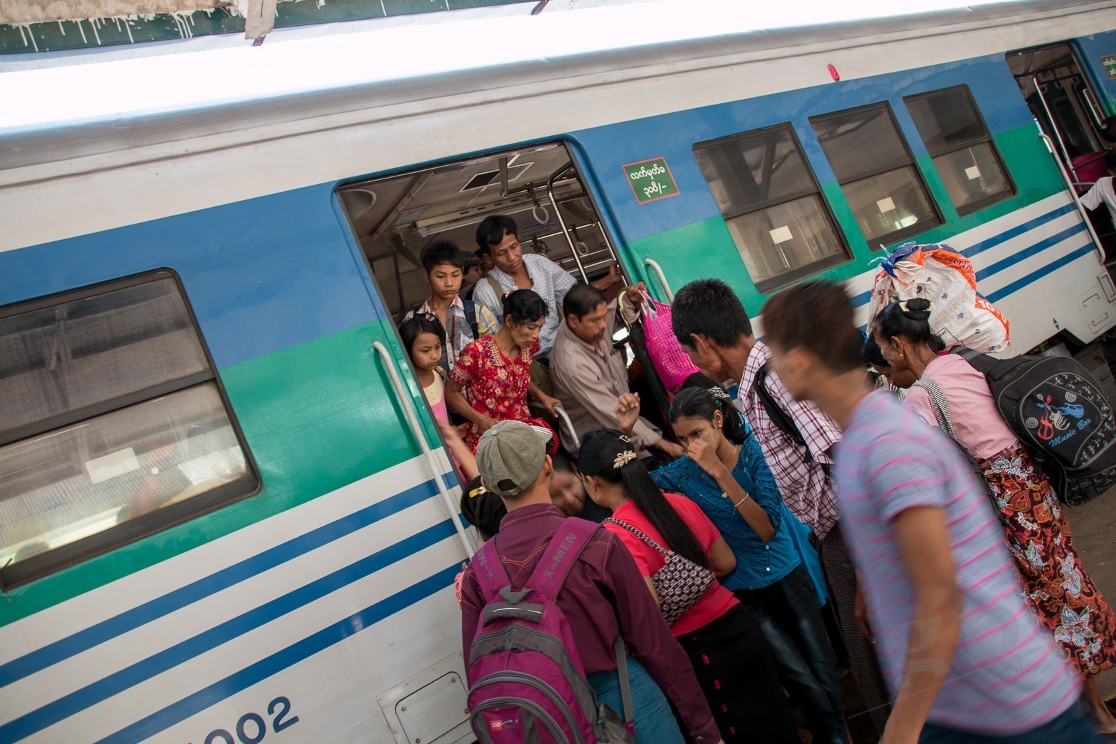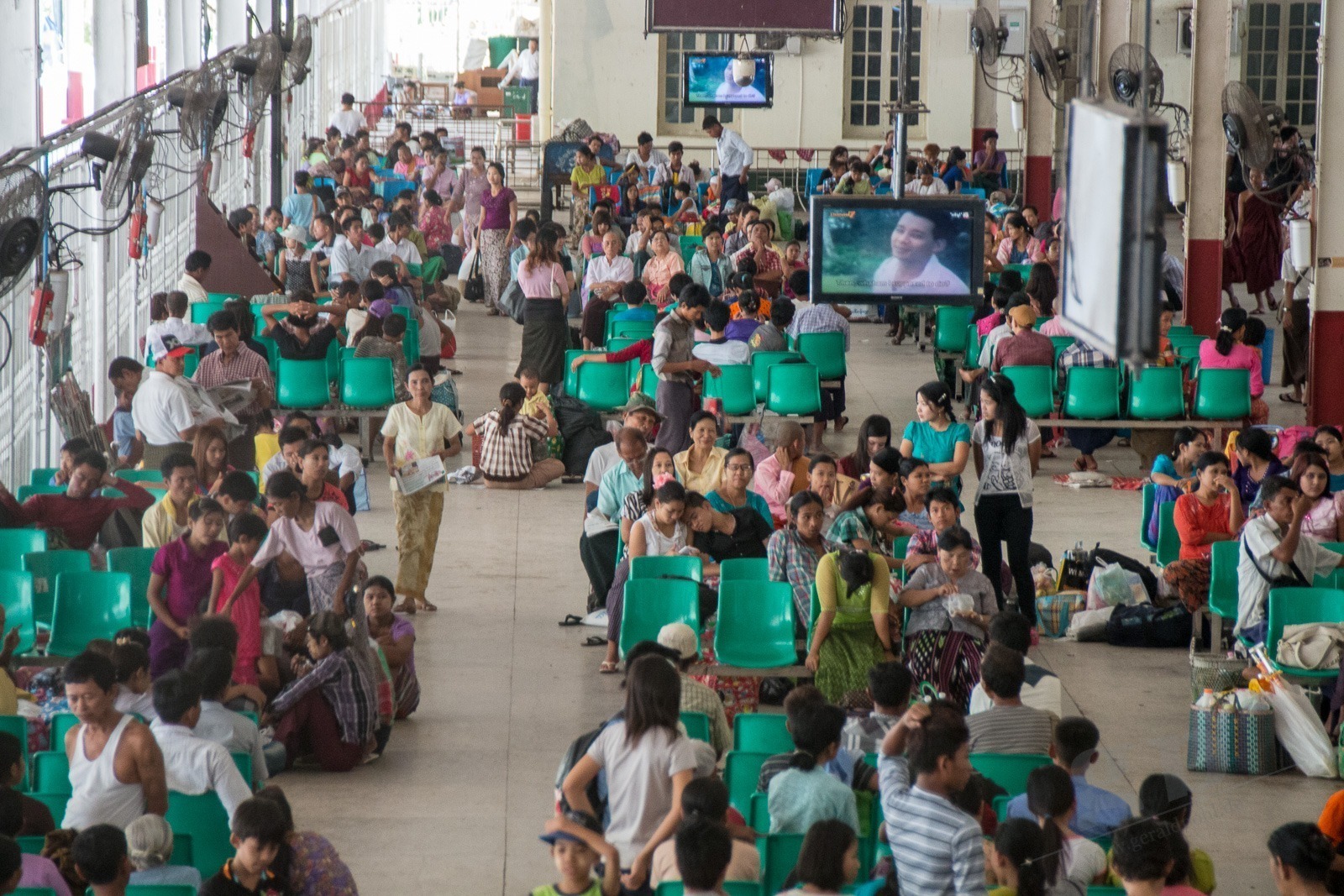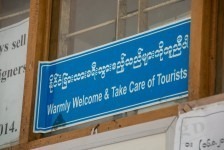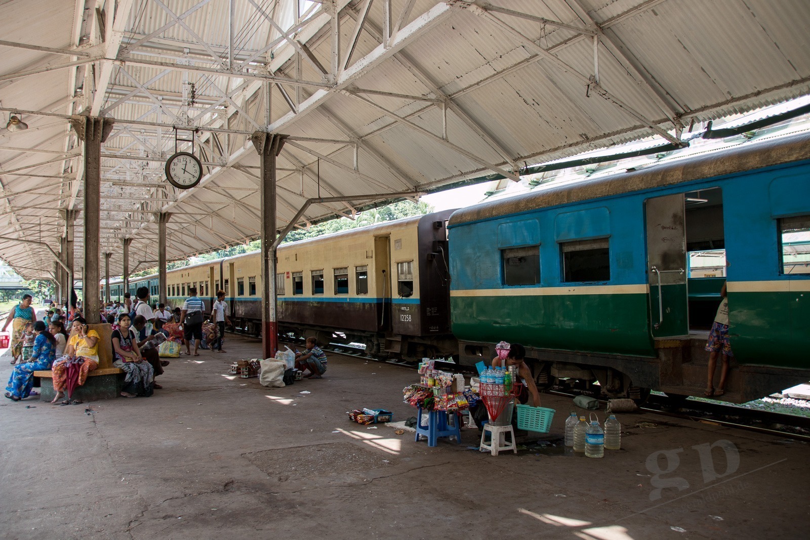Es wird Zeit für unsere nächste Station: in Yangon gibt es eine Bahnstrecke rund um die Stadt herum. In Berlin heißt das Ringbahn. Hier heißt das Circuit-Line. Wir fragen uns erst einmal zum Ticket-Schalter durch. Wir sehen hier auch wieder eines der Schilder die an vielen Orten hängen: „Warmly Welcome and take care of tourists!“ Stimmt! Wir fühlen uns herzlich Willkommen in Myanmar und da wir etwas hilflos nach unserem Zug suchen nimmt uns ein alter Mann an die Hand und führt uns quer über die Gleise zu unserem Zug. Danke! Wir steigen in einen alten klapprigen Zug. Wir haben die Luxus-Variante gebucht mit Air Condition. Für 300 Kyats (ca 0,25€). Die Air Condition besteht aus offenen Fenstern und Ventilatoren unter der Decke. Diese funktionieren allerdings bei uns nicht. Egal. Wir unterhalten uns mit einer Engländerin und einem Deutschen die hier in Myanmar bei der britischen bzw bei der deutschen Botschaft arbeiten. So bekommen wir einen ganz besonderen Einblick in Myanmar. Die Bahnfahrt geht durch Dörfer und Reisfelder, an Pagoden vorbei und an einigen Golfplätzen. Wir schaffen ca 50km in 3,5 Stunden.