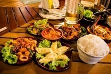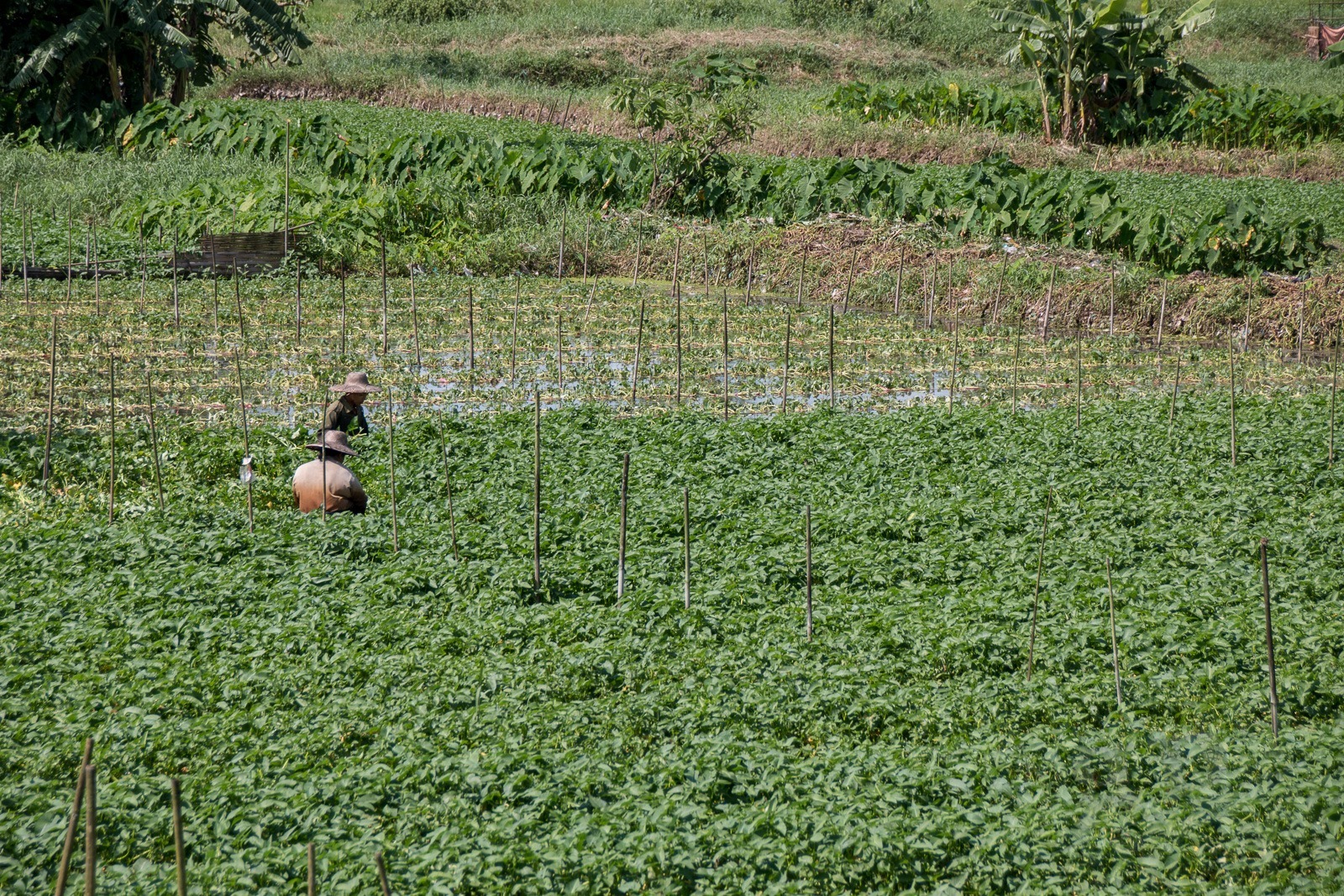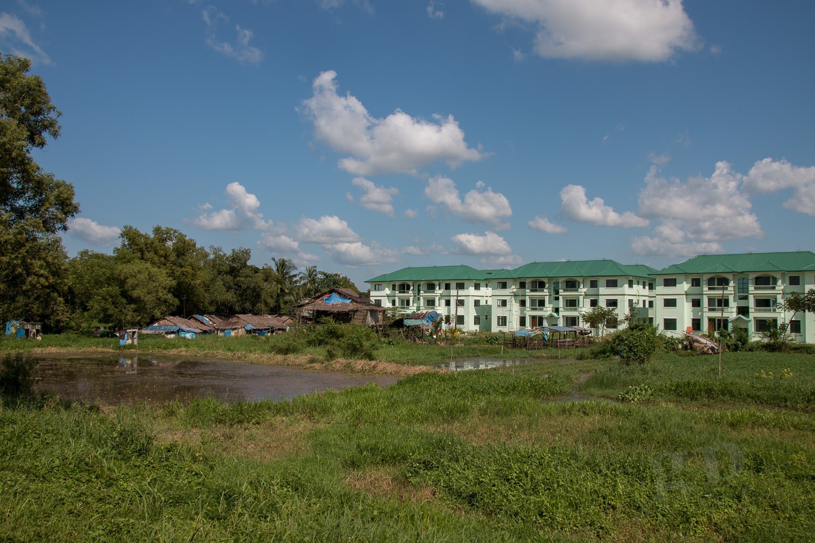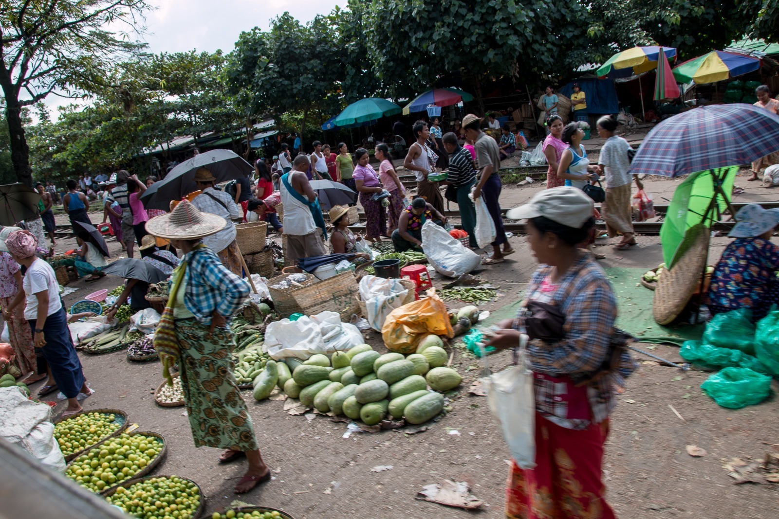 Es wird Zeit für unsere nächste Station: in Yangon gibt es eine Bahnstrecke rund um die Stadt herum. In Berlin heißt das Ringbahn. Hier heißt das Circuit-Line. Wir fragen uns erst einmal zum Ticket-Schalter durch. Wir sehen hier auch wieder eines der Schilder die an vielen Orten hängen: „Warmly Welcome and take care of tourists!“ Stimmt! Wir fühlen uns herzlich Willkommen in Myanmar und da wir etwas hilflos nach unserem Zug suchen nimmt uns ein alter Mann an die Hand und führt uns quer über die Gleise zu unserem Zug. Danke! Wir steigen in einen alten klapprigen Zug. Wir haben die Luxus-Variante gebucht mit Air Condition. Für 300 Kyats (ca 0,25€). Die Air Condition besteht aus offenen Fenstern und Ventilatoren unter der Decke. Diese funktionieren allerdings bei uns nicht. Egal. Wir unterhalten uns mit einer Engländerin und einem Deutschen die hier in Myanmar bei der britischen bzw bei der deutschen Botschaft arbeiten. So bekommen wir einen ganz besonderen Einblick in Myanmar. Die Bahnfahrt geht durch Dörfer und Reisfelder, an Pagoden vorbei und an einigen Golfplätzen. Wir schaffen ca 50km in 3,5 Stunden.