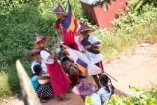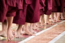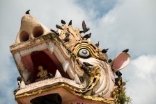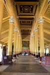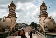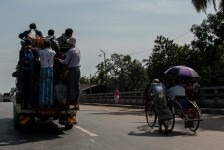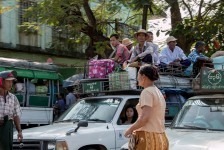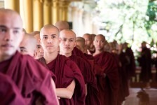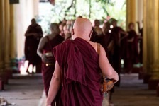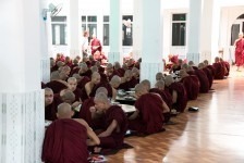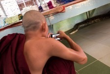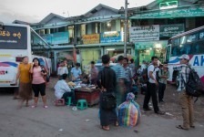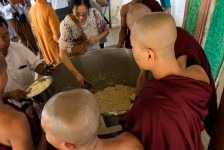 Mönche im Kha Khat Wain Kyaung Kloster, BagoNach unserem traditionellen Frühstück machen wir uns mit dem Taxi und unserem Taxifahrer als Guide auf den Weg nach Bago nördlich von Yangon. Wir kommen an vielen Militäreinrichtungen vorbei. Lange Zeit war Myanmar eine Militär-Diktatur, die gerade dabei ist sich selbst aufzulösen. Myanmar ist auf dem Weg zur Demokratie. Und unser Taxi fährt übrigens mit AutoGas. Das ist hier ziemlich in Myanmar und vorallem in den Städten ziemlich verbreitet und um einiges günstiger als Benzin. Das Benzin kostet hier ungefähr 1,-€ pro Liter. Bei einem durchschnittlichen Jahreseinkommen von nicht mal 900,-€! Nach ca. zwei Stunden erreichen wir Bago. Als erstes Ziel am Ortseingang sehen wir die vier Buddhas. Die Buddhas sind riesengroß und schauen in alle vier Himmelsrichtungen. Wir kaufen uns eine Eintrittskarte die auch für alle anderen Sehenswürdigkeiten in Bago gilt. Nur noch eine Foto-Gebühr kommt hinzu. 300 Kyat. Das sind etwa 0,30€. Der nächste Stop führt uns zu einem Kloster. Wir sind dabei wie die Mönche zum Essen „marschieren“ und dabei von Gläubigen aus aller Welt beschenkt werden: Reis, Stifte, Geld …. An uns ziehen etwa 1000 Mönche vorbei. Jeder mit seinem eigenen Topf. Es herrscht eine ganz besondere Stimmung an diesem Ort und zu dieser Zeit. Weiter geht’s auf unserer Sightseeingtour durch Bago zum alten Königs-Palast. Alt ist der Palast eigentlich nicht, denn er ist rekonstruiert worden. Mit modernen Mitteln: Beton. Aber trotzdem lässt er einen Einblick in die Größe und Schönheit des ursprünglichen Palastes erahnen: Gold wohin das Auge blickt und jede Menge Säulen. Wir sind ein weiteres Mal beeindruckt. Auf dem Weg zur größten Pagode machen wir noch einen Zwischenstopp an der Schlangen-Pagode: vor uns liegt etwa 40cm entfernt eine riesige Python ohne Gitter oder sonst etwas als Absperrung. Die Schlange ist riesig und wird von einem Hellseher mit Geld beworfen. Es gibt sogar Wechselgeld zurück. Die große Shwemawdaw-Pagode in Bago ist ebenfalls beeindruckend: sie ist noch höher als die Shwedagon-Pagode in Yangon. Und ebenfalls aus Gold. Oder zumindest in Gold gestrichen. Um die Pagode herum gibt es wie auf einem Rummel „Automaten“ in die man Geld werden kann um zur Erlösung zu finden. Ein Rummelplatz. Eigentlich ist ganz Bago ein großer Rummelplatz: hier gibt es sogar eine Skate-World: ein ca 50qm großer Platz auf dem man mit Rollschuhe oder Skateboard fahren kann. Vorletzte Station in Bago ist der schlafende Buddha. Ich kannte Buddhas bisher nur als sitzende und meditierende Statuen. Aber hier liegt ein liegender Buddha mit 55 Länge vor uns. Ein Riese! Und Buddha sei Dank ist dieser auch überdacht. Als wir vor ca. drei Minuten die Halle betreten scheint die Sonne. Nun Regent es in Strömen. Und 10 Minuten später ist wieder alles vorbei. Wir tapsen draußen noch barfuß durch ein paar Sturzbäche und eine halbe Stunde später ist wieder alles trocken. Das sind die letzten Ausläufer des Monsun. Gegen 15uhr machen wir uns wieder auf den Weg Richtung Yangon mit einem Zwischenstopp in einem Restaurant. Unser Taxi-Guide setzt uns direkt am Busbahnhof ab und wir checken bei unserem Busunternehmen ein. Im Warte-„Saal“ läuft der Film „Schiffbruch mit Tiger – The life of Pie“. Ohne Ton. Aber trotzdem verständlich um was es geht. Gegen 19Uhr kommt unser Bus und wir sehen wie die Einheimischen sich langsam Jacken überziehen und ebenso lange Hosen. Wir hatten im Vorfeld bereits in einigen Internet-Foren gelesen, dass die Busse unheimlich heruntergekühlt werden. Wie eigentlich überall wo es eine Klima-Anlage gibt. In Yangon sammeln sich sogar Menschenmassen vor Geschäften mit offenen Türen und heruntergekühlten Verkaufsräumen für eine kleine Erfrischung. In unserem Bus haben Einige bereits bei der Abfahrt eine Mütze auf und eine Jacke an. Die Busse sind wahrscheinlich die einzigen Orte in Myanmar, wo man eine Jacke oder eine Mütze benötigt. In Deutschland geht man im Winter in die Sauna. In Myanmar fährt man im Sommer einfach Bus. Aber der Bus ist sehr luxuriös ausgestattet: Lederliegesessel, Kissen, Decken und auf dem Sitz wartet bereits eine Flasche Wasser. Auch die Sitzplätze sind sehr geräumig. Nach ein paar Kilometer wird uns Kaffee angeboten und es gibt Kuchen dazu. Wir sind gespannt was uns noch erwartet, denn wir werden erst am nächsten Morgen um 5 Uhr in Kalaw sein. Die Air-Condition schafft es auf 14 Grad im Bus bei 30 Grad Außentemperatur! Es ist kurz nach 22 Uhr und wir machen einen Zwischenstopp. André und ich beschließen uns ein großes Myanmar Bier zu kaufen um doch noch einschlafen zu können trotz der lauten Musik im TV vom „Myanmar Model & Talents“-Wettbewerb. Wir sind auf einem riesigen Rasthof mit vielen Bars und Restaurants und Straßenverkäufern. Wir setzen uns in das größte und vollste Restaurant. Und schon schreit die Bedienung um Hilfe. In dem ganzen Laden spricht scheinbar nur eine Bedienung Englisch. Und da wir die einzigen Ausländer sind wir wieder einmal DIE Attraktion für die Gäste.