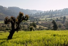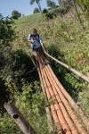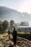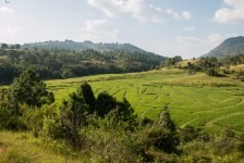 Mein Frühstück besteht aus Toastbrot. Und als Spezialmedizin bekomme ich einen unheimlich starken grünen Tee. Hunger hab ich nicht wirklich. Und die Wanderung ist für mich unheimlich anstrengend. Ich hab in der letzten Nacht unheimlich viel Energie verloren. Aber dafür ist der Weg sehr schön und abwechslungsreich. Eine tolle Belohnung für die Anstrengung. Wir gehen durch Felder mit Rosenkohl, Ingwer, Chili, Tomaten, Kartoffeln, Reis und Weizen. Zwischendurch essen wir grünen Pfeffer direkt vom Busch. Sehr frisch. Sehr lecker. Auf unserem Weg begegnen wir immer wieder den Wasserbüffeln die hier als Nutztiere gehalten werden. Einige schauen sehr aggressiv. Außerdem lernen Wir, dass man den Schatten einen Mönchs nicht kreuzen darf. Da der Schatten am Morgen allerdings ziemlich lang ist, macht uns der Mönch Platz und nimmt seinen Schatten gleich mit auf die Seite. Danke Mönch!