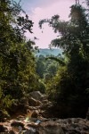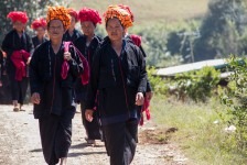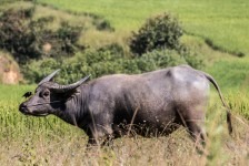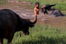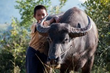 Die heiße Mittagssonne nutzen wir für eine Auszeit: in einem Dorf quartiert uns unser Guide in einem Haus der Einheimischen ein. Und als die Hausherrin nach Hause kommt ist diese sehr erfreut über den unerwarteten Besuch. Ich bin Stolz von den leckeren Nudeln mit Gemüse doch einen Großteil gegessen zu haben. Nach dem Essen gönnen wir uns noch ein kleines Mittagsschläfchen. Das tut gut. Bis zu unserem Tagesziel sind es nur noch zwei Stunden und es geht bergauf und bergab. Wir treffen auf Büffel, die mit Kindern zusammen ein Bad nehmen. Eine herrliche Szenerie.