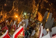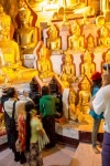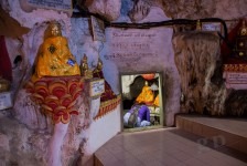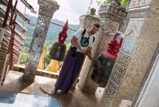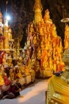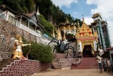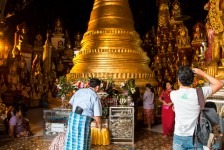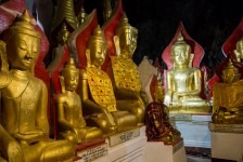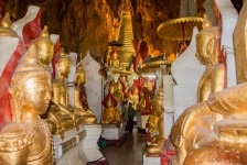Heute ist erstmal ausschlafen angesagt. Zumindest bis 6:30 Uhr, denn wir machen einen Tagesausflug mit dem Taxi nach Pindaya. Unsere Fahrt führt uns als erstes durch etwas größere Agrarstrukturen in die Berge. Es geht eigentlich nur über einspurige Straßen oder Schotterwege vorwärts und im Schnitt fahren wir keine 40km/h. Die Dörfer werden immer kleiner und abgelegener. Immer häufiger müssen wir wegen Rinderherden auf der Straße anhalten. Nach etwas mehr als zwei Stunden erreichen wir Pindaya. Vor uns streckt sich am Berg eine Klosteranlage mit vielen überdachten Treppenaufgängen im Zickzack empor. Als wir die Höhle betreten erwarten uns direkt viele viele Buddhas in unterschiedlichen Größen. In der Mitte steht eine große Pagode direkt im Eingang zur Höhle. Alles ist aus Gold. Nach kurzer Zeit entdecken wir einen schmalen Gang direkt hinter der Pagode weiter hinein in die Höhle. Und uns erwarten noch mehr goldene Buddhas. Große und Kleine. Die Gänge sind unheimlich schmal, denn alles ist vollgestellt mit Buddhas in mehreren Etagen. Es stehen mehr als 8000 Buddhas in dieser Höhle. Wir brauchen mehr als 2 Stunden um uns die gesamte Höhle anzuschauen. Es ist beeindruckend! Myanmar ist einfach verrückt nach Buddha!