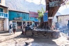 Ab jetzt sind wir zu dritt: Marleen hat einen Hund gestreichelt. Wir dachten der Hund gehört zum Teahouse, aber scheinbar ist es ein Streuner. Er wird uns bis zum Tagesziel verfolgen und Marleen hat ihm auch schon einen Namen gegeben: Chapati. Nach Ghermu geht es wieder auf die andere Seite des Flusses und wieder auf der Sandpiste weiter nach Jagat. Jagat ist eigentlich unser Tagesziel für heute, aber da für morgen 22km auf dem plan stehen wollen wir noch ein Dorf weitergehen. Nach Chyamche. In Jagat werden wir schon von jedem Lodge- und Hotelbesitzer auf eine Unterkunft angesprochen. Aber wir wollen weiter. Der Weg nach Chyamche geht wieder abseits der Piste entlang und natürlich, wie sollte es anders sein, mit einem langen Anstieg über Treppenstufen hinauf zum „Mongolian Guesthouse“. Leider mittlerweile eine Ruine. Aber der Weg ist wunderschön und führt an Bananenstauden vorbei. Man kommt sich vor wie im Dschungel. Und kühler ist es hier auch! Wir haben durch die Sonne den ersten Sonnenbrand 🙂 Gegen 17Uhr erreichen wir endlich Chyamche. Das wird Zeit! „Unser“ Hund Chapati folgt uns bis in unser Zimmer! In unserem Hotel gibt es etwas ganz besonderes: eine warme Dusche! Wir haben einen Riesen-Hunger und ausgehungert wie wir Beide mittlerweile sind gibt es erstmal eine Ladung „Dhaal Bhat“ und zusätzlich noch „Momos“. Das haben wir uns heute auch verdient! Oder auf nepalesisch: Mito chaa! Lecker!