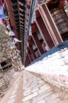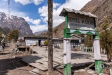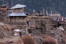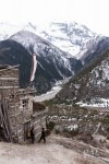 Heute starten wir wieder um 7 Uhr um nicht wieder in die Rushhour der Trekker zu kommen. Wir sehen steile Berghänge rechts und links und je mehr Höhe wir gewinnen umso mehr Nadelwälder sehen wir. In Bhratang essen wir erstmal einen Apfel-Pfannkuchen. Das ist eine Empfehlung aus unserem Trekking-Buch. Die Gegend ist bekannt für seine Äpfel.Die Sonne scheint mit voller Kraft, wie in den letzten Tagen auch. Aber wärmen kann sie nicht mehr so richtig. Nachdem wir wieder einige Hängebrücken überwunden haben sehen wir die „Rampe“. Eine mächtige glatte Felswand, deren höchster Punkt bei 5000m liegt und der tiefste bei 2000. Einfach gewaltig!!! Nach dem Örtchen „Dhuker Pokhari“ biegen wir rechts ab in ein Kiefern-„Wäldchen“. Wald wäre auch übertreiben, denn es steht nur alle 5-6 Meter eine Kiefer. Es wird die schönste Strecke des Tages: es ist so still und ruhig. In der Ferne hört man nur das leise Rauschen des Flusses. Nach einer Stunde sind wir in „Upper Pisang“ für unsere Knoblauch-Suppe mit tibetischem Brot. Und das brauchen wir auch: und uns wartet ein steiler Anstieg zu unserem Ziel: Ghyaru. Von einer Hängebrücke Können wir unser Ziel sehen wenn wir steil nach oben schauen: es gilt 380 Höhenmeter in Serpentinen direkt nach oben zu „laufen“. Es fallen ein paar Schneeflocken und es wird weiter oben immer mehr schneien. Dieser Aufstieg ist unheimlich anstrengend! Wir sind auf 3700m Höhe und die Luft wird immer dünner. Wir kommen ganz schön ins Pusten mit unserem Gepäck von ca 18/19kg. Auf dem Weg nach oben sieht man die Häuser nicht. Erst einige Meter vor dem Ziel tauchen die ersten Häuser von Ghyaru auf. Ich halte immer wieder an um nach Luft zu schnappen, aber nach 1,5 Stunden bin ich oben. WOW! Das macht glücklich. Vorallem weil der Schneefall immer stärker wird. Am Nachmittag sitzen wir mit drei Engländern in der Küche unserer Unterkunft und wärmen uns mit Tee am offenen Feuer auf. Heute morgen sind wir noch im T-Shirt gelaufen und nun liegen hier schon ein paar Zentimeter Schnee. Was für ein Tag!