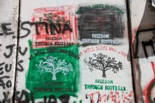 Der nächste Halt ist direkt an der Mauer. Auf dieser Seite der Mauer gibt es eine Menge Graffiti und einige Plakate kleben auf dem Beton. Immer wieder sind Wachtürme zu sehen. Einige sind besetzt, andere nicht. Diese Mauer ist einfach unfassbar und selbst der internationale Gerichtshof hält diese Mauer für einen Verstoß gegen das Völkerrecht!