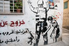 Es wird Zeit sich die andere Seite anzuschauen. Wieder geht es durch Checkpoints auf die israelische Seite. Die Straße ist wie ausgestorben. Vereinzelt sind ein paar Männer zu sehen. Jetzt wird klar, warum die Palästinenser diesen Teil der Stadt „Ghostcity – Geisterstadt“ nennen. Aber auch hier sind immer wieder Soldaten unterwegs. Auch in gepanzerten Fahrzeugen. Und auch hier Graffiti an den Wänden und Plakate. Dieses mal aber aus Sicht der Israelis, die darauf „hinweisen“, dass dieses Land Ihnen gehört und die Araber Mörder seien. Wieder ein extrem. Diesmal von der anderen Seite. In den oberen Stockwerken sind auf dieser Seite die Fenster vergittert. Hinter den Gittern leben Palästinenser deren Eingänge auf der anderen Seite liegen.
