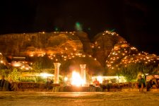 Anschließend machen wir uns auf den Weg nach Petra, der Stadt in der Wüste. Und dazu geht es für drei Stunden mit dem Auto durch die Wüste. Als wir in unserem Zeltcamp ankommen ist es bereits dunkel. Das Camp ist mit kleinen Kerzen erleuchtet. Auch auf den Felsen um das Camp herum leuchten Kerzen und im Lager brennt ein Lagerfeuer. Bei Tee und orientalischer Musik lassen wir den Abend ausklingen. Das nenn‘ ich Urlaub!