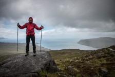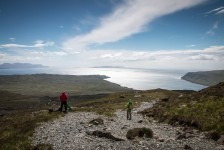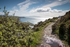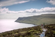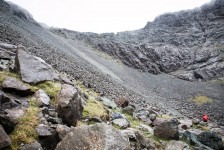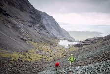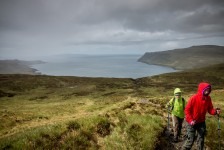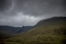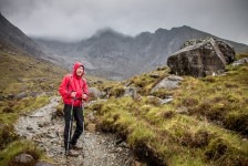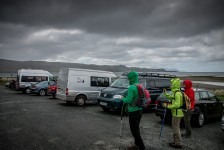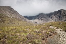 Nach dem Frühstück geht’s wieder auf die Straße Richtung Süden. Wir wollen eine Wanderung in den Cuillin Hills machen. Unser Parkplatz liegt direkt am Sandstrand der Campsite Glenbrittle und diese Campsite wiederum direkt am Meer. Es regnet mal wieder ein bisschen als wir aufbrechen. Unser Wanderweg führt uns stetig bergauf zu den schwarz und monströs wirkenden Bergen direkt oberhalb des Meeres. Die Gipfel liegen in einer Wolkenschicht. Der Weg führt vorbei an vielen kleinen Bächen und kleinen Seen. Eine kleine steilere Kletterpartie erwartet uns neben einem Wasserfall. Und anschließend sind wir in einem Hochtal mit einem kleinen See. Um uns herum bilden die schwarzen Felsen eine Art Amphitheater. Hier wird der Weg schwieriger, da es über Geröllfelder weitergeht, die unter uns immer wieder abrutschen. Aber andere Wanderer haben das vor uns auch geschafft. Als wir am Gipfelgrad angekommen sind und auf die andere Seite blicken, weht dort ein stürmischer Wind, der uns fast mitreißt. Wir versuchen auf der anderen Seite den Weg für den Abstieg zu finden, aber hier liegt nur noch mehr Geröll und es ist noch steiler. Einen Weg können wir hier leider nicht finden. Und auch nicht etwas weiter im Westen. Nach ein paar gefährlichen Kletterpartien in den Wolken beschließen wir umzukehren und auf dem gleichen Weg wieder zurückzulaufen auf dem wir gekommen sind. Dafür werden wir nach einiger Zeit mit strahlend schönem Sonnenschein belohnt. Herrlich mit dieser Aussicht auf das Meer und den Inseln der Hebriden und dazu dem Sandstrand unter uns. Und direkt neben uns rauscht der Wasserfall herab.