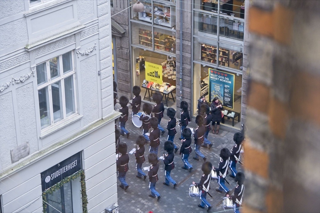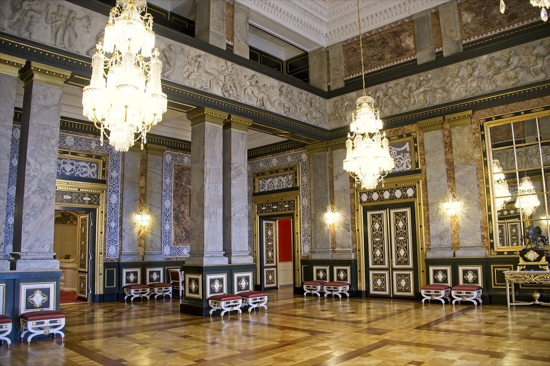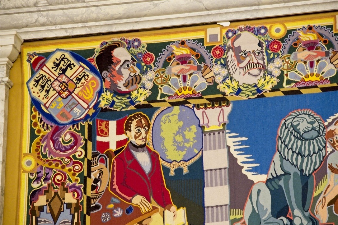 Nach dem Mittagessen gehe ich zu dem nicht weit entfernten Schloss Christiansborg. Dieses Schloss ist der offizielle Sitz der Königin und des Parlaments. Die Königin und ihre Familie wohnt allerdings in einem anderen Schloss in Kopenhagen: Amalienborg. Schloss Christiansborg ist erst 1920 fertig gestellt worden. An diesen Ort stehen zwar seit Jahrhunderten die Schlösser und Burgen der dänischen Könige, aber diese sind schon oft abgebrannt. In diesem Schloss empfängt die Königin Staatsbesuche und lädt zu Banketten ein. Die Architektur ist eine gelungene Mischung aus einem alten Schloss und modernen Elementen. Im Rittersaal hängen zum Beispiel moderne Wandteppiche, welche die Geschichte Dänemarks zeigen. Von weitem sehen die Wände wie aus der Renaissance oder dem Barock aus, und erst wenn man sich den Inhalt der Teppiche genauer betrachtet sieht man die moderne Gestaltung. Ich entdecke Wikinger genauso wie Bismarck, Stalin und Einstein. Ja sogar Karl Marx ist auf einem Teppich zu sehen.