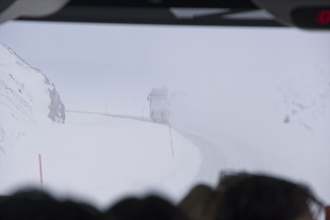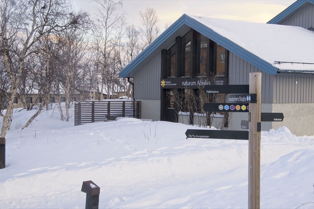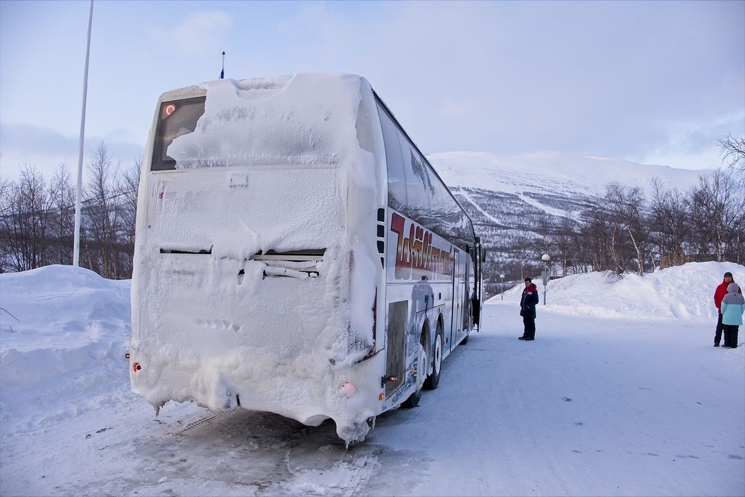Durch die grau-weiße Winterlandschaft geht es weiter in Richtung Norden. Der Bus fährt durch unendliche Wälder, deren Zweige mit einer dicken Schneeschicht bedeckt sind. Ich checke zwischendurch immer mal wieder verschiedene Seiten, ob die Straße geöffnet ist. Auf der offiziellen norwegischen Webseite für den Straßenverkehr ist keine Sperrung verzeichnet. Bei Google Maps gibt es keinen Hinweis zu einer Straßensperrung. Allerdings auf der offiziellen schwedischen Webseite für den Straßenverkehr springt mir ein eindeutiges Stop-Schild entgegen. Das Schild verschwindet auch nicht, als wir uns der Grenze nähern und mittlerweile sogar blauer Himmel zu sehen ist. In Abisko bzw an der Abisko Touristation ist erst einmal Schluss. Unser Busfahrer fährt mit einem weiteren Busfahrer noch weiter in das nächste kleine Dörfchen um zu prüfen, ob wir weiterfahren können oder nicht. Währenddessen unterhalte ich mich mit anderen Reisenden, die wohl schon seit mehreren Tagen auf die Weiterreise nach Narvik warten. Jedes mal wenn der Bus stoppt, bildet sich eine kleine Menschentraube und die Fragen sind fast immer: „Are you going to Narvik?“