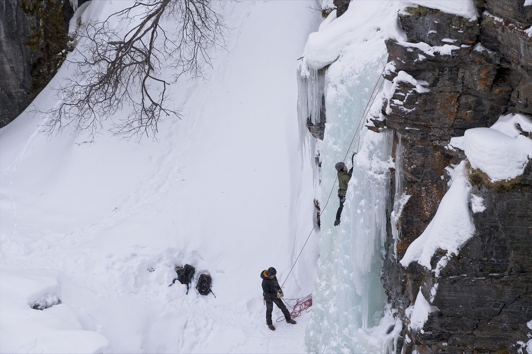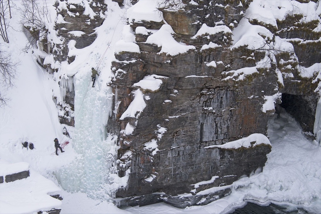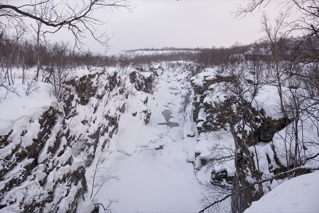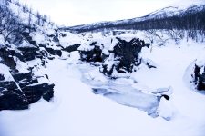 An der Rezeption bekomme ich zu einem guten Preis ein Einzelzimmer mit Frühstück. Mittags gibt es in einem Meetingraum eine kurze Vorstellung des Nationalparks in dem mein Hotel steht und natürlich auch zu den hoffentlich zu erwartenden Polarlichtern. Am Nachmittag mache ich noch eine kleine Wanderung zu der Schlucht in der Nähe. Die Schlucht ist etwa 20-30m tief und an einigen Stellen ist das Eis aufgebrochen und man kann das Wasser darunter rauschen hören und fließen sehen. An einigen Stellen gibt es größere und kleinere Wasserfälle. An einem Wasserfall wird gerade auf Eis geklettert. Es ist kurz nach 14Uhr und ich bemerke schon, wie das Licht weniger wird. Hier oben etwa 400km nördlich des Polarkreises geht die Sonne viel früher unter. Wenn sie denn erst einmal aufgegangen ist.