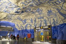 Die Nacht war doch ganz schön schaukelig auf der Ostsee. Meine Kabine liegt dazu auch noch ziemlich weit oben auf dem Schiff: Deck 9 von 10 bzw 11 wenn ich das Sonnendeck mitrechne. Auf dem Weg nach Stockholm gibt es wieder eine Zeitverschiebung um eine Stunde und so bin ich um 6.30Uhr auch schon auf dem Weg zum Sonnendeck um die Sonne zu begrüßen. Das Fährschiff ist vor kurzem von der Ostsee in das Stockholm-Archipel abgebogen. Das Archipel besteht aus hunderten von Inseln zwischen Ostsee und Stockholm. Meine Fähre reit sich ein in eine Schlange von mehreren Schiffen, die durch diese Insellandschaft tuckern. Einige Inseln sind so klein, dass dort nur ein paar Vögel platz haben. Auf anderen Inseln stehen ein paar Holzhäuser mit kleinen Bootshäusern und auf einer großen Insel steht sogar eine Festungsanlage. Die Sonne kriecht langsam hinter den bewaldeten Inseln hervor und ich mache einen Zwischenstopp am Frühstücksbuffet. Gestärkt genieße ich anschließend wieder die Aussicht vom Sonnendeck auf die Insellandschaft im Wasser. Um kurz nach 10 legt das Schiff in Stockholm an und ich fahre mit der U-Bahn, die hier in Stockholm „Tunnelbana“ heißt. Ich hatte im Internet ein Foto aus der Tunnelbana-Station „Centralen“, dem Hauptbahnhof, gesehen und frage mich nach dem Weg zu diesem Bahnsteig durch. Ganz tief unten sieht der Tunnel so aus, als ob er aus dem groben Fels gehauen wurde und mit blau-weißer Farbe angestrichen wurde. Darauf sind in einem Teil in blauer Farbe Arbeiter gemalt, die auf Gerüsten mit Bohrern und Hämmern an diesem Tunnel bauen. An einer anderen Stelle verziehen blaue Ähren den weiß-blauen Tunnel. Das sieht richtig toll aus!