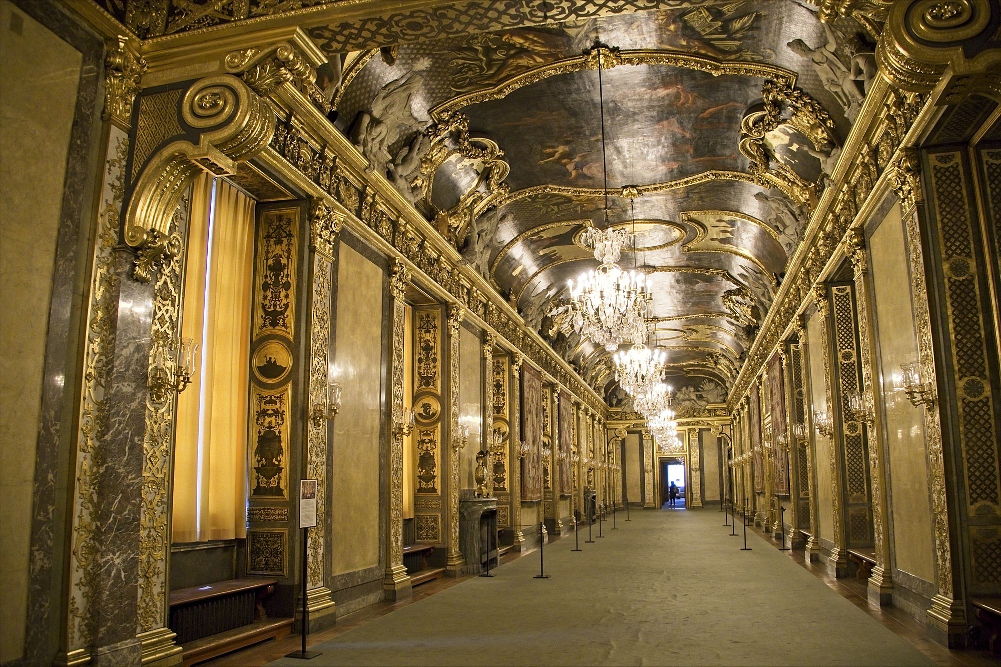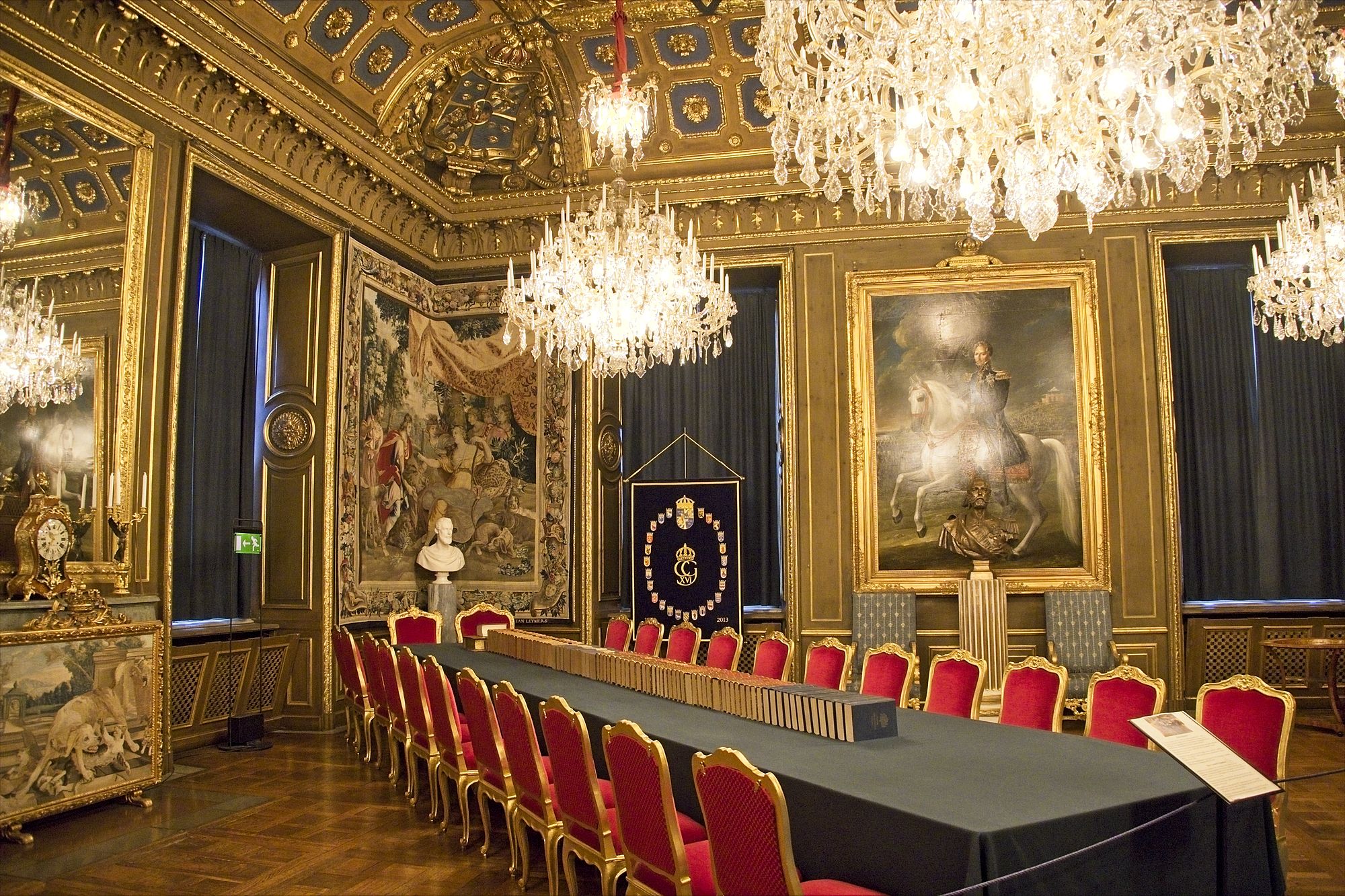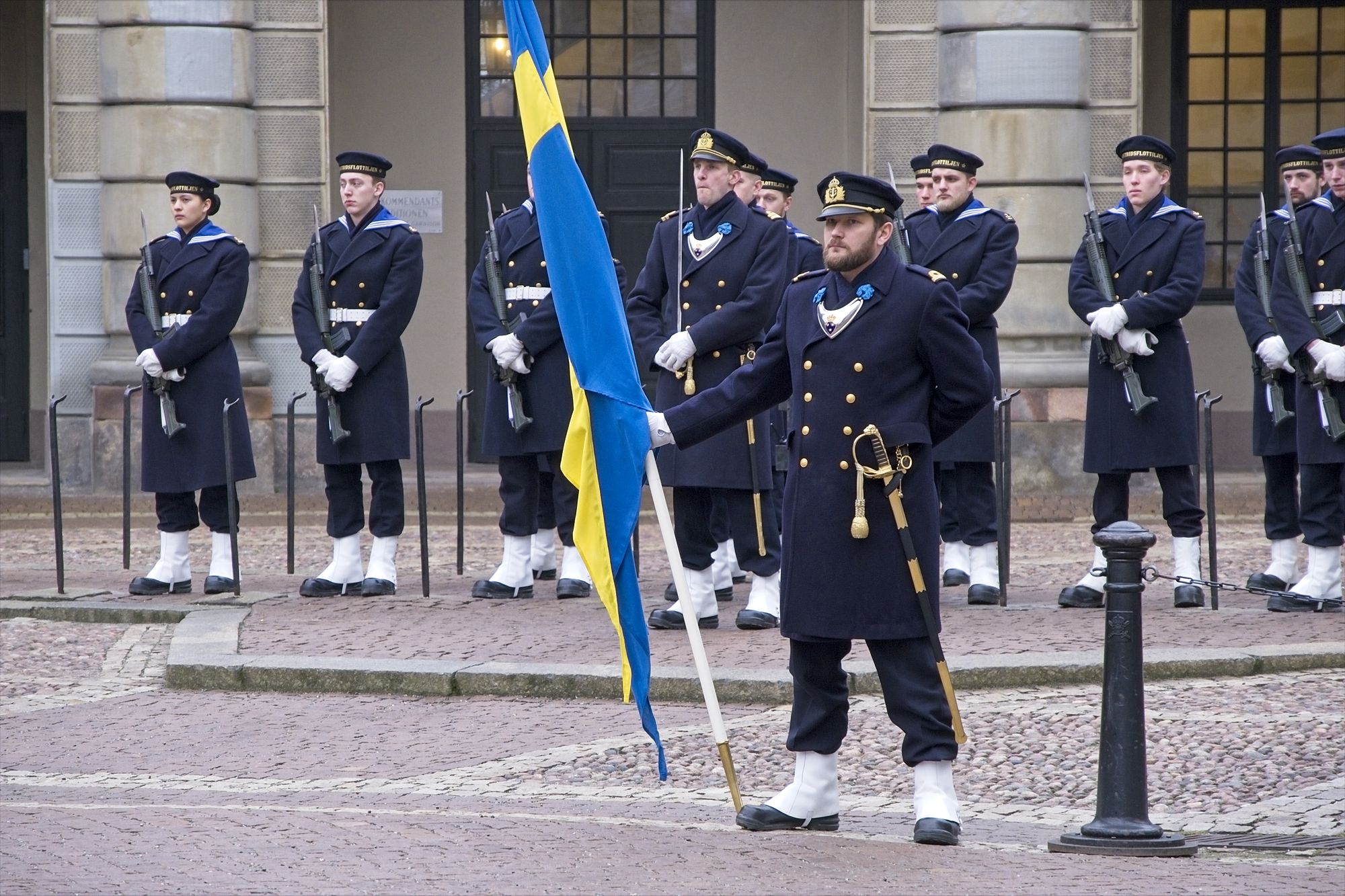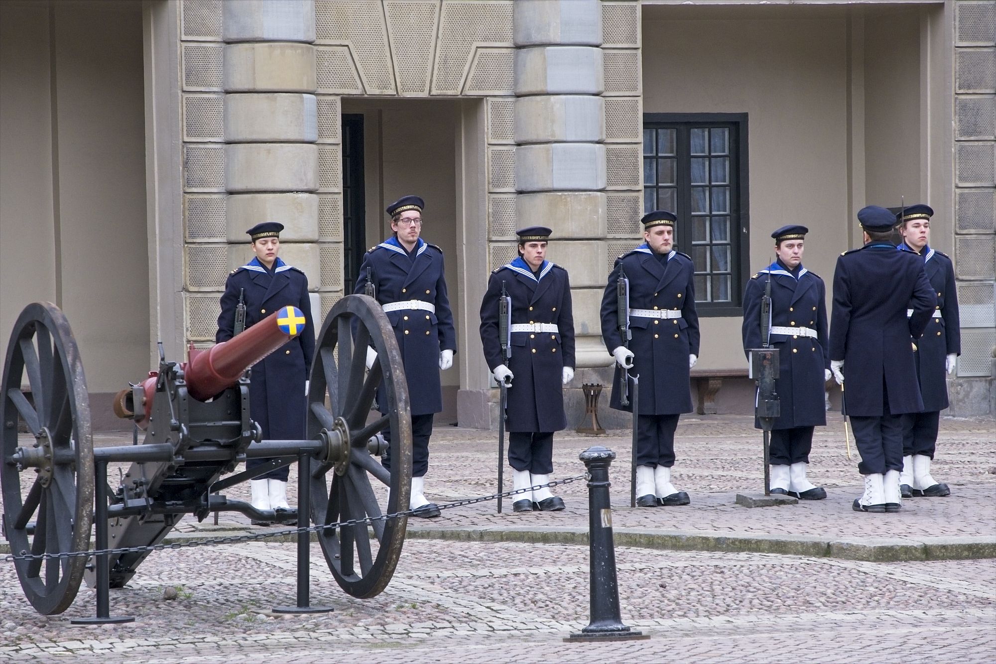 Zu Fuß mache ich mich nach der morgendlichen Stärkung dann auf den Weg in die Altstadt. Mein Weg führt mich durch eine moderne Einkaufs-Fußgängerzone. Am Ende der Fußgängerzone erreiche ich über eine Brücke den schwedischen Reichstag. Ich bin beeindruckt: Das Gebäude des schwedischen Reichstags ist um einiges größer als das Deutsche Reichstags-Gebäude. Der Reichstag liegt auf einer Insel. Leider ist eine Besichtigung nur am Wochenende möglich. Über die nächste Brücke erreiche ich die Stockholmer Altstadt. Auch diese Altstadt liegt auf einer Insel. Das erste, was mir auf dieser Insel ins Auge springt, ist das Stockholmer Schloss. Dieses Schloß gehört zu den größten Schlössern Europas und ist der Repräsentationssitz des schwedischen Königs. Der König und die königliche Familie sind allerdings vor einigen Jahren in ein Schloss auf dem Land gezogen. Ich erreiche das Schloss pünktlich um 10Uhr zu einem Wachwechsel. Die Soldaten in alten Marine-Uniformen marschieren durch den recht kleinen halbrunden Vorhof zum Schloss. Das Schloss selbst betrete ich über das große Treppenhaus. Die ersten Räume, die ich besichtige geben einen Überblick über Orden und Uniformen, bevor es dann durch verschiedene Tronsäle, Audienzräume, Schlafzimmer und Esszimmer über mehrere Etagen geht. Die Säle sind wundervoll mit Figuren aus Marmor an der Decke ausgestattet. Kleine und große Marmor-Engel schauen auf mich herab Von den Deckengemälden blicken Gestalten aus Sagen und Mythen zu mir herunter. Das Schloss ist voller Prunk: Goldene Stühle und Wandbehänge, riesige Kronleuchter und Marmorsäulen. Aber auch mehrere dutzend goldene Uhren und riesige Porzellanvasen schmücken die Räume. Im Keller des Schlosses sind sehr schön die verschiedenen Ausbaustufen des Schlosses zu sehen. Wie auch in Kopenhagen ist das Schloss in Stockholm in seiner Geschichte mehrfach abgebrannt und wieder aufgebaut worden. Im Keller auf der anderen Seite des Schlosses ist die Schatzkammer mit verschiedenen Kronen und Schwertern zu sehen: Jede Menge Gold und Edelsteine. Aber leider darf man hier nicht fotografieren. Um 12Uhr Startet dann auf dem Vorhof der große Wachwechsel. Allerdings unterscheidet sich dieser scheinbar nur durch die Salutschüsse, die von weitem zu Hören sind.