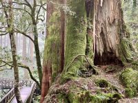 Also schnell das Gepäck im Hotel abgegeben und los geht’s auf die Wanderungen im Park. Es sind auch wieder Wolken aufgezogen hier oben auf mehr als 2000m Höhe. Das ergibt eine tolle Atmosphäre mit den Zedern und den alten Baumriesen, von denen manche mehr als 1000 Jahre alt sind. Einer der Bäume ist sogar 2300 Jahre alt. Viele Bäume sind auf den Überresten der eigenen Eltern und Großeltern gewachsen, was zu fantastischen Formationen führt. Und zusammen mit dem Nebel einfach toll.