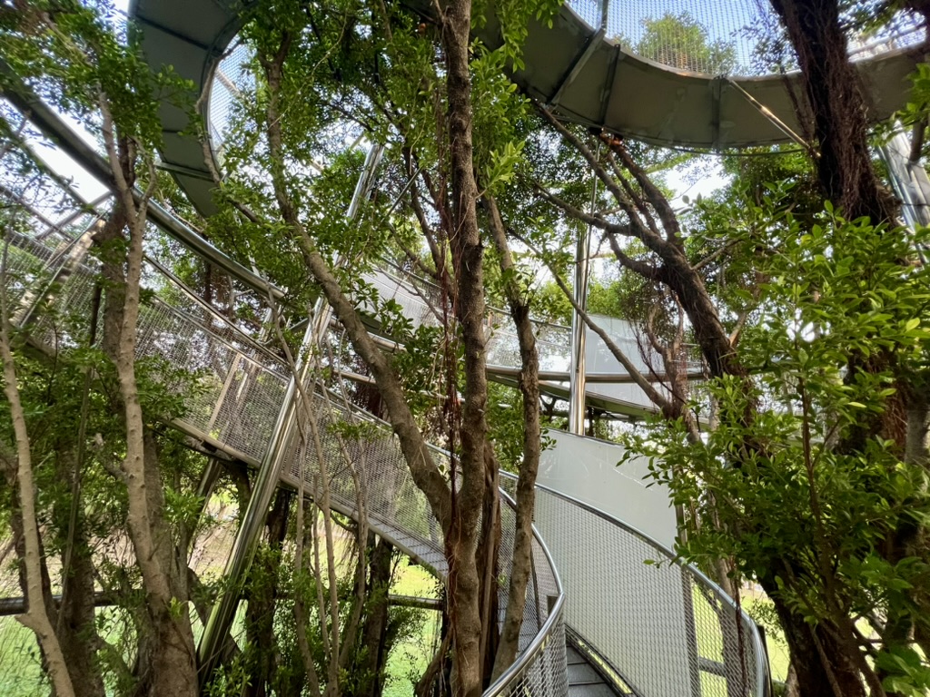 Und das ist ziemlich cool! Vieles ist direkt in die Umgebung eingebunden. Man kann sogar in einem Baum hinauflaufen. Und in den alten Lagerhallen sind tolle kleine Shops.