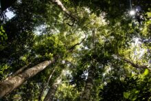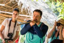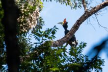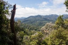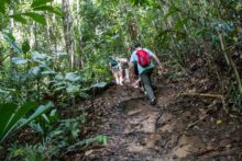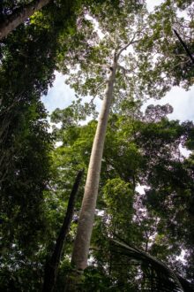 Im Anschluss geht es noch weiter nach oben. Wir wandern auf den Gipfel des nahen Berges mit seinen 344m Höhe. Das klingt nicht viel, aber bei der Hitze und der extremen Luftfeuchtigkeit hier ist das schon ziemlich anstrengend. Hier ist einfach jeder komplett nass geschwitzt. Aber die Aussicht lohnt sich: soweit das Auge schauen kann ist es grün… Alles ist Regenwald.
