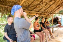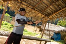 Am Nachmittag fahre ich mit einem Boot zu einem Dorf der Orang Asli. Orange Asli bedeutet Waldmenschen. Dieses Volk ist vor langer Zeit aus Afrika nach Malaysia gekommen. Ihre afrikanischen Wurzeln sieht man ihnen noch an. Diese Menschen leben als Nomaden im Wald und ernähren sich auch von diesem Wald. Ich hatte von anderen Reisenden viel Gutes über diese Tour gehört. Und dem kann ich nur zustimmen, denn es geht erst einmal mit dem Langboot durch einige Stromschnellen und wir bekommen eine ordentliche Dusche. Im Dorf der Waldmenschen setzen wir uns in eines der Häuser und unser Guide erzählt uns von der Lebensweise der Menschen. Wie wird Feuer gemacht oder ein Blasrohr hergestellt. Die dünnen Pfeile sind mit dem Gift eines Baumes getränkt und in wenigen Minuten tödlich. Beim Blasrohrschießen bin ich gar nicht mal so schlecht und verfehle das Ziel, eine Tweety Stoffpuppe nur knapp.