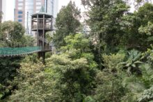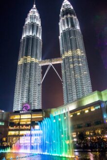 In Chinatown stehen alte, kleine Häuschen neben großen Neubauten. Im moderneren Teil Chinatowns gibt es unzählige Geschäfte und Restaurants. Bei meinem Spaziergang erreiche ich einen kleinen Dschungelpark mitten in der Stadt. Der Park heißt „Taman Eko Rimba KL“ und beherbergt sogar einen 200m langen Canopy Walk über und in den Baumkronen des Waldes. Die Geräuschkulisse sagt mir, dass hier auch einige Tiere leben. Ich folge weiter der Strasse und gelange ins „goldene Dreieck“. Hier stehen dicht an dicht die Hochhäuser und Wolkenkratzer. Die Architektur dieser Riesen ist ziemlich verspielt und abwechslungsreich. Ich bekomme fast schon Nackenschmerzen vom ständigen nach oben schauen. Und dann sehen ich sie. Das Wahrzeichen der Stadt Kuala Lumpur: die Petronas-Zwillingstürme. Die beiden 452 Meter hohen Türme sind in der 41. und 42. Etage mit einer Sky Bridge verbunden. Direkt unterhalb der beiden Türme liegt der KLCC-Park mit kleinen Hügeln, kleinen Seen und sogar mit Spielplatz und einem Planschbecken für die Kinder. Hier lässt es sich doch relaxen. Und als die Sonne untergeht schaue ich mir ein Schauspiel aus Wasser, Licht und Musik an.